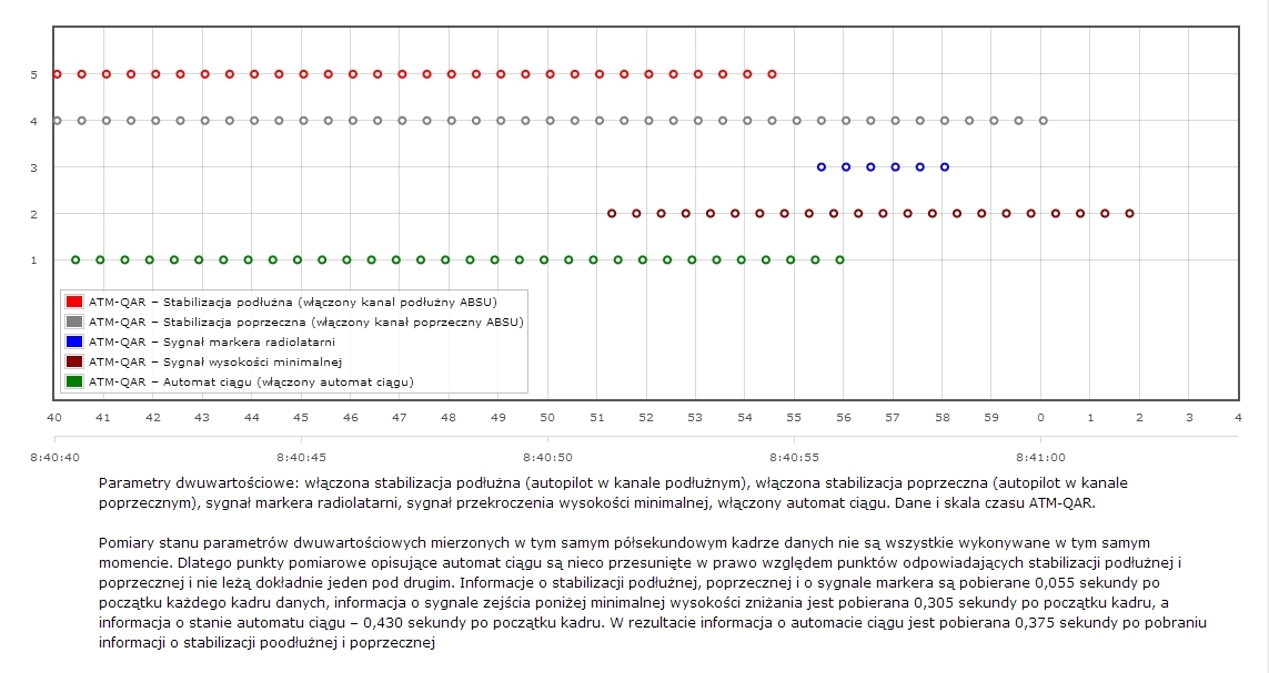 Z zapisu parametrów dwuwartościowych można oba te momenty określić z dokładnością do pół sekundy. Kanał podłużny był włączony o 8:40:54,56, a o 8:40:55,06 już nie był. Podobnie z automatem ciągu. W momencie pomiaru o 8:40:55,93 był włączony, a o 8:40:56,43 już nie był.